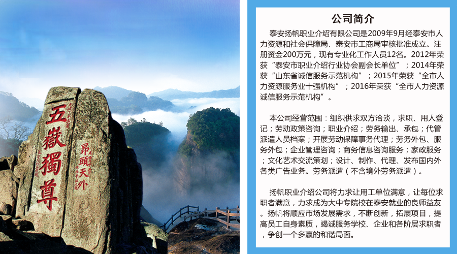 泰安揚帆職業(yè)介紹有限公司是2009年9月經泰安市人力資源和社會保障局、泰安市工商局審核批準成立。注冊資金200萬元,現(xiàn)有專業(yè)化工作人員12名。2012年榮獲“泰安市職業(yè)介紹行業(yè)協(xié)會副會長單位”;2014年榮獲“山東省誠信服務示范機構”;2015年榮獲“全市人力資源服務業(yè)十強機構”;2016年榮獲“全市人力資源誠信服務示范機構”。